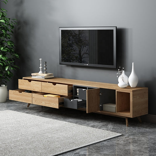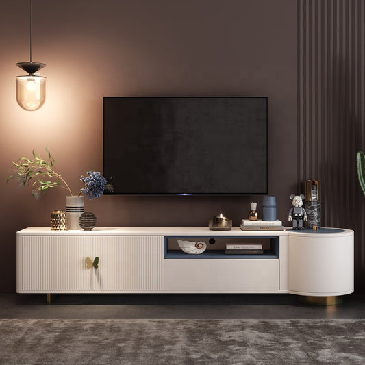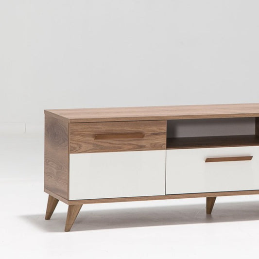طاولة تلفاز تتكون من 3 أرفف مفتوحة ودرج قلاب صغير و درج قلاب جانبي كبير
