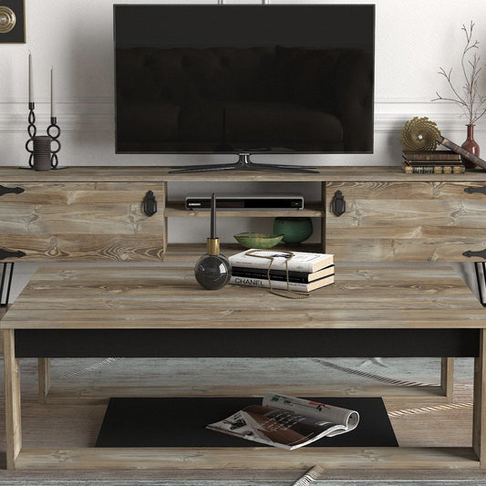 طاولة تلفاز تتكون من 3 أرفف مفتوحة ودرج قلاب صغير و درج قلاب جانبي كبير