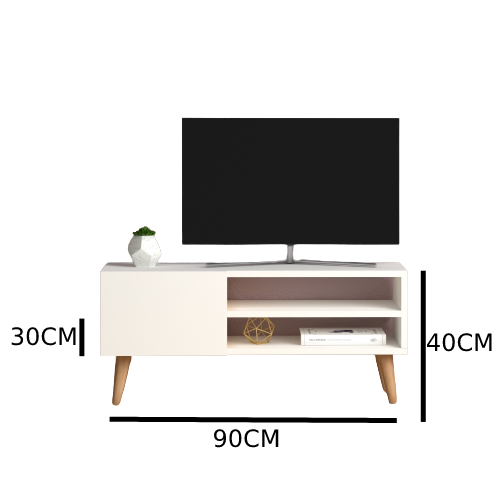 طاولة تلفاز تكون من رفين مفتوحين من جانب و وحدة تخزين من جانب اخر