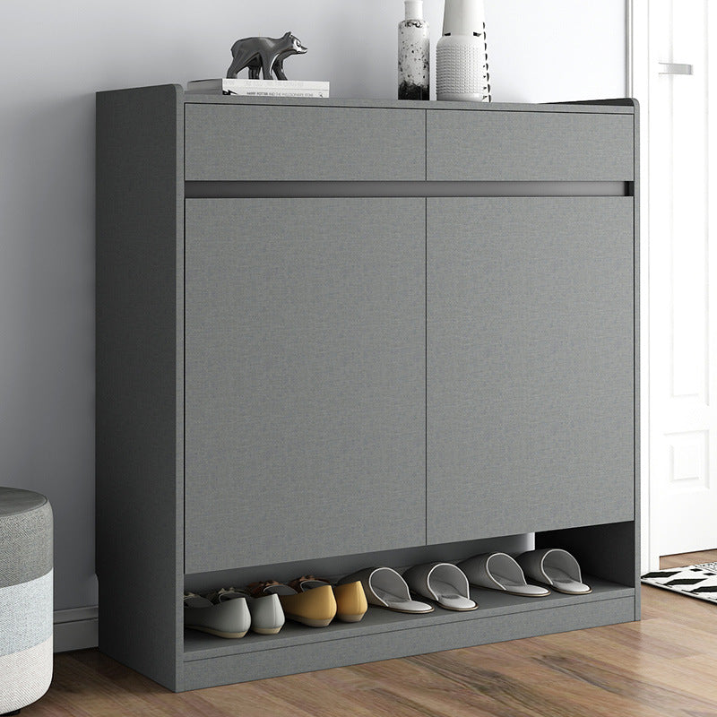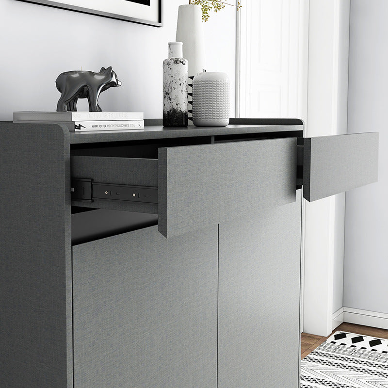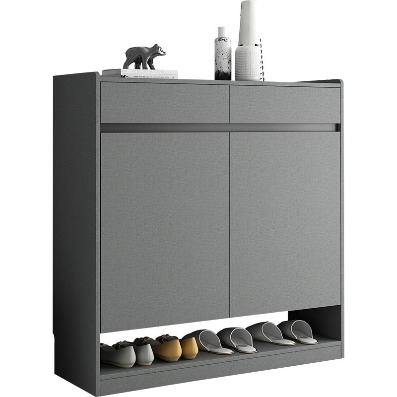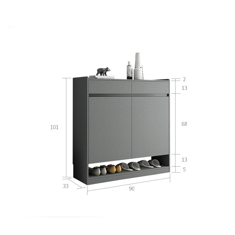 خزانة أحذية مودرن بأدراج وأرفف، مصنوعة من خشب طبيعي بلون رمادي. تصميم عصري يوفر تخزينًا مرتبًا للأحذية بدون احتلال مساحة كبيرة.
