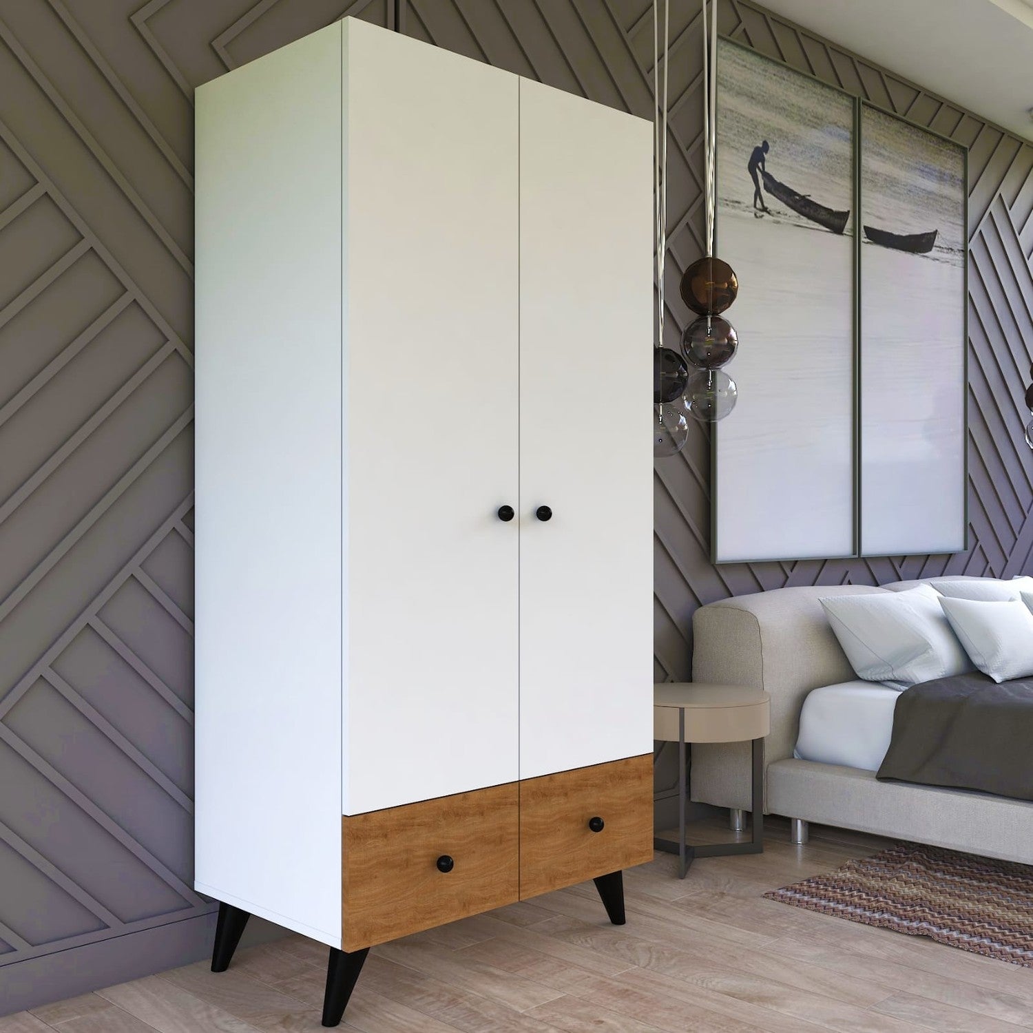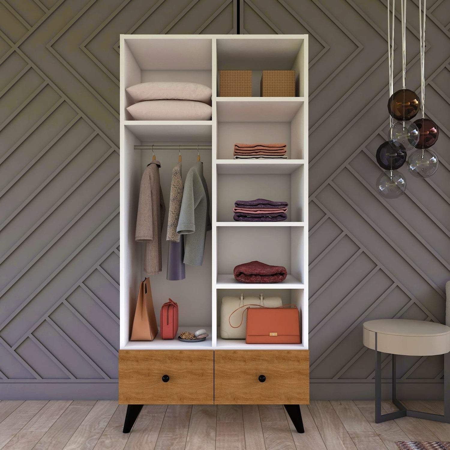دولاب يتكون من 4 أرفف من جهة و علاقة ملابس و رف علوي من جهة اخرى + درجي