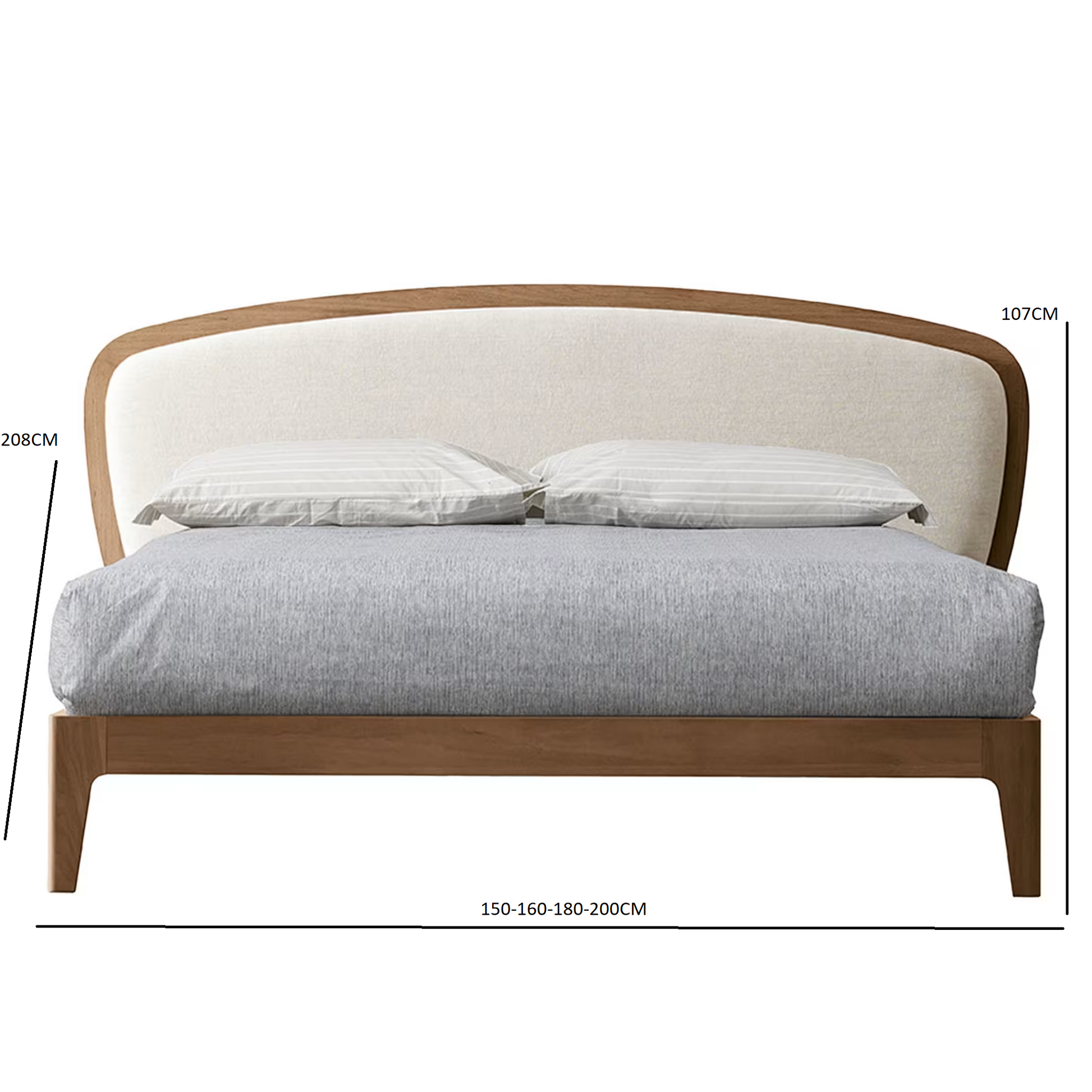 سرير من الخشب مع تنجيد فاخر يتميز بتصميم أنيق ومريح، حيث يأتي بأبعاد متناسبة بارتفاع 107 سم، عمق 208 سم، وعرض يتراوح بين 150 إلى 200 سم. مصنوعة من خشب طبيعي، تضفي على السرير لمسة من الفخامة والجودة، بينما يضيف التنجيد من القماش الراقي شعوراً بالراحة والرفاهية. يجمع بين اللون البني الدافئ والبيج المتناغم، مما يجعله خياراً مثالياً لتكامل الديكور في أي غرفة نوم.