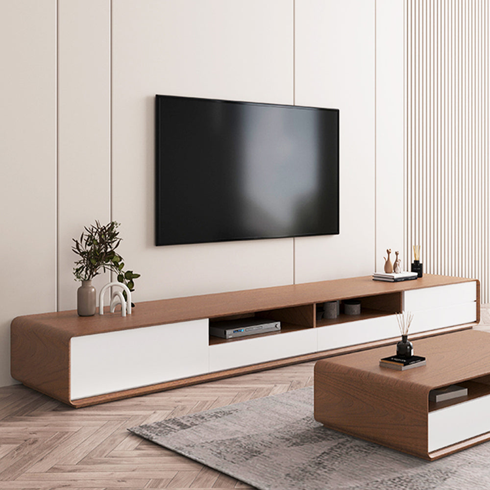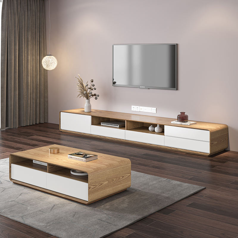 طاولة تلفاز وقهوة بتصميم راقي، اللون يجمع بين الخشب الغامق والأبيض أو الفاتح. مقاسات مثالية للتلفاز (200x40x38 سم) والقهوة (130x70x38 سم). مصنوعة من خشب طبيعي لضمان الجودة والأناقة.