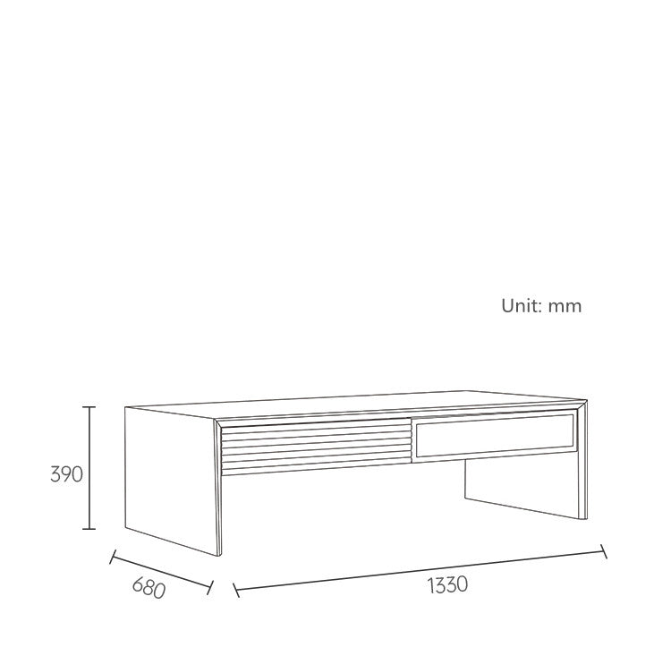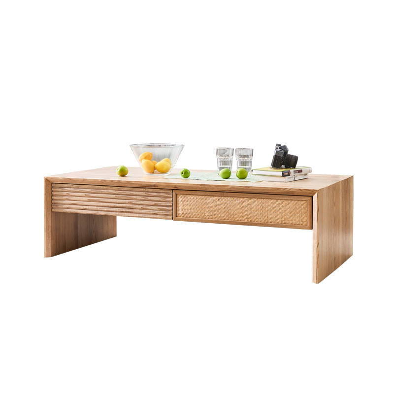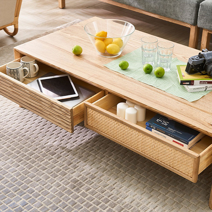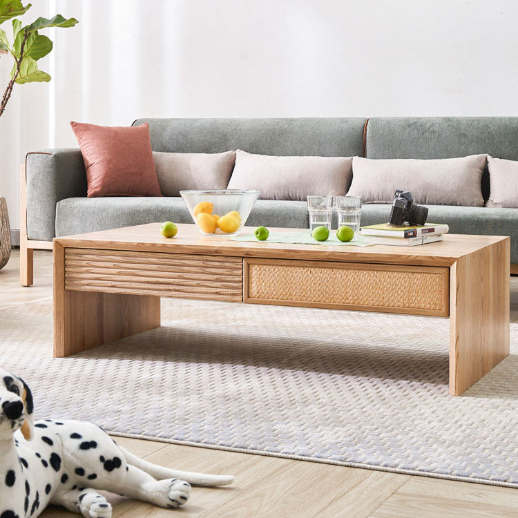طاولة قهوة بتصميم مودرن ولمسة طبيعية بفضل استخدام الخشب الطبيعي. تتميز بلون خشبي فاتح وتضم اثنين من الأدراج لتوفير مساحة تخزين إضافية بأناقة.