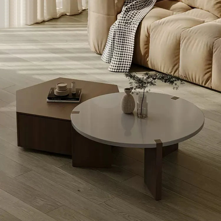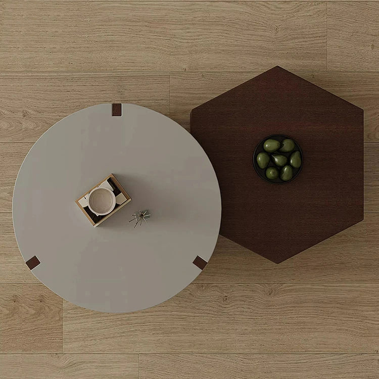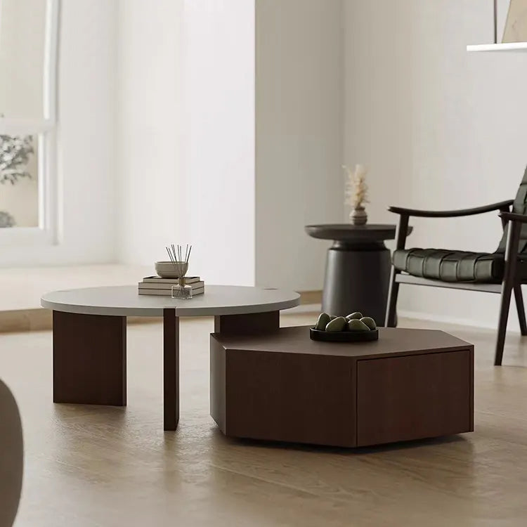 طاولة قهوة عصرية بتصميم مميز، مصنوعة من خشب طبيعي والزان باللونين البني والأبيض الداكن، تتألف من قطعتين بأحجام مختلفة. تضيف لمسة عصرية وأنيقة لأي مساحة، مثالية لتناول القهوة وتوضيب المجلات.