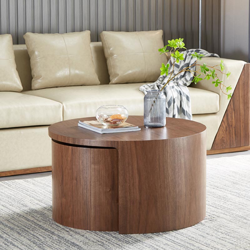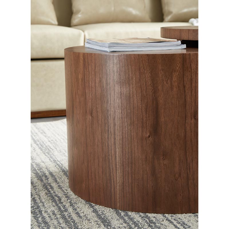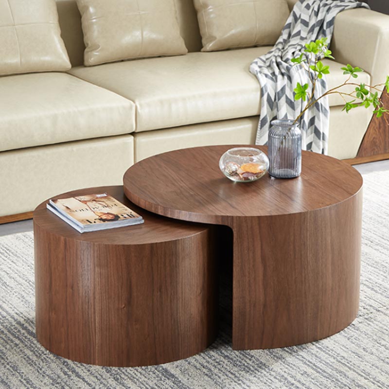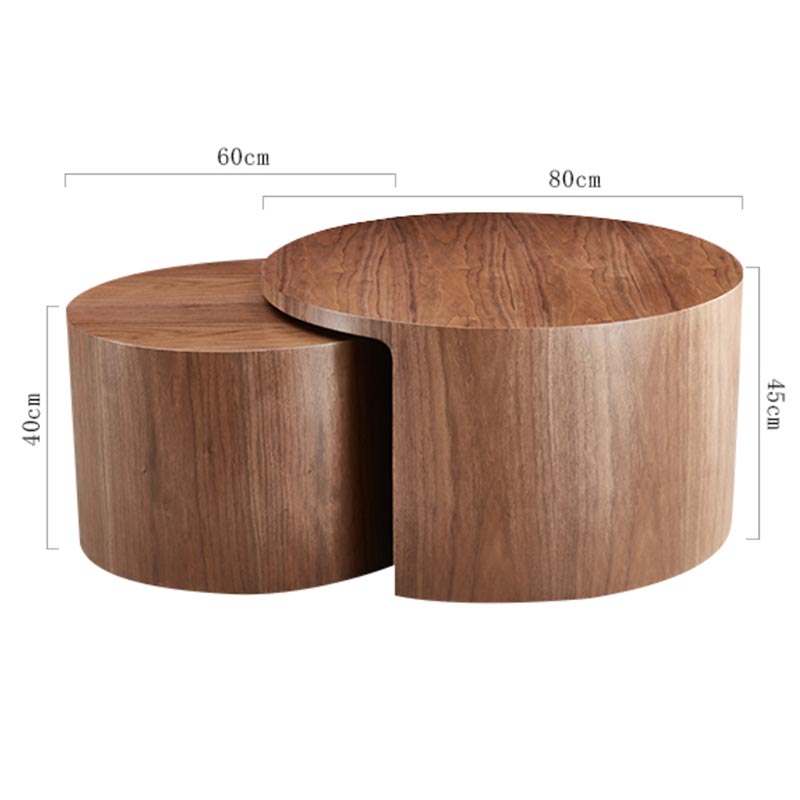 طاولة قهوة متداخلة بتصميم بسيط وأنيق، مصنوعة من خشب طبيعي بلون خشبي غامق. تتألف من طاولتين بأحجام مختلفة (قطر 80سم وقطر 60سم)، مما يوفر مرونة في الترتيب. مثالية لتزيين غرفة المعيشة، مع مواصفات تفصيلية.