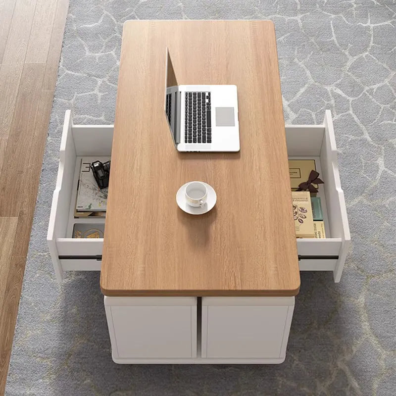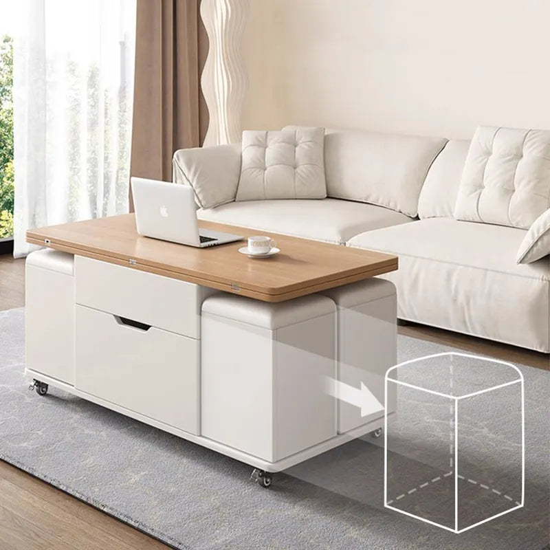 طاولة قهوة متعددة الاستخدامات مع 4 مقاعد، تتميز باللونين الأبيض والخشبي الفاتح، مصنوعة من خشب طبيعي ومقاعد مبطنة بالجلد، تضفي لمسة عصرية وأناقة على أي مساحة.