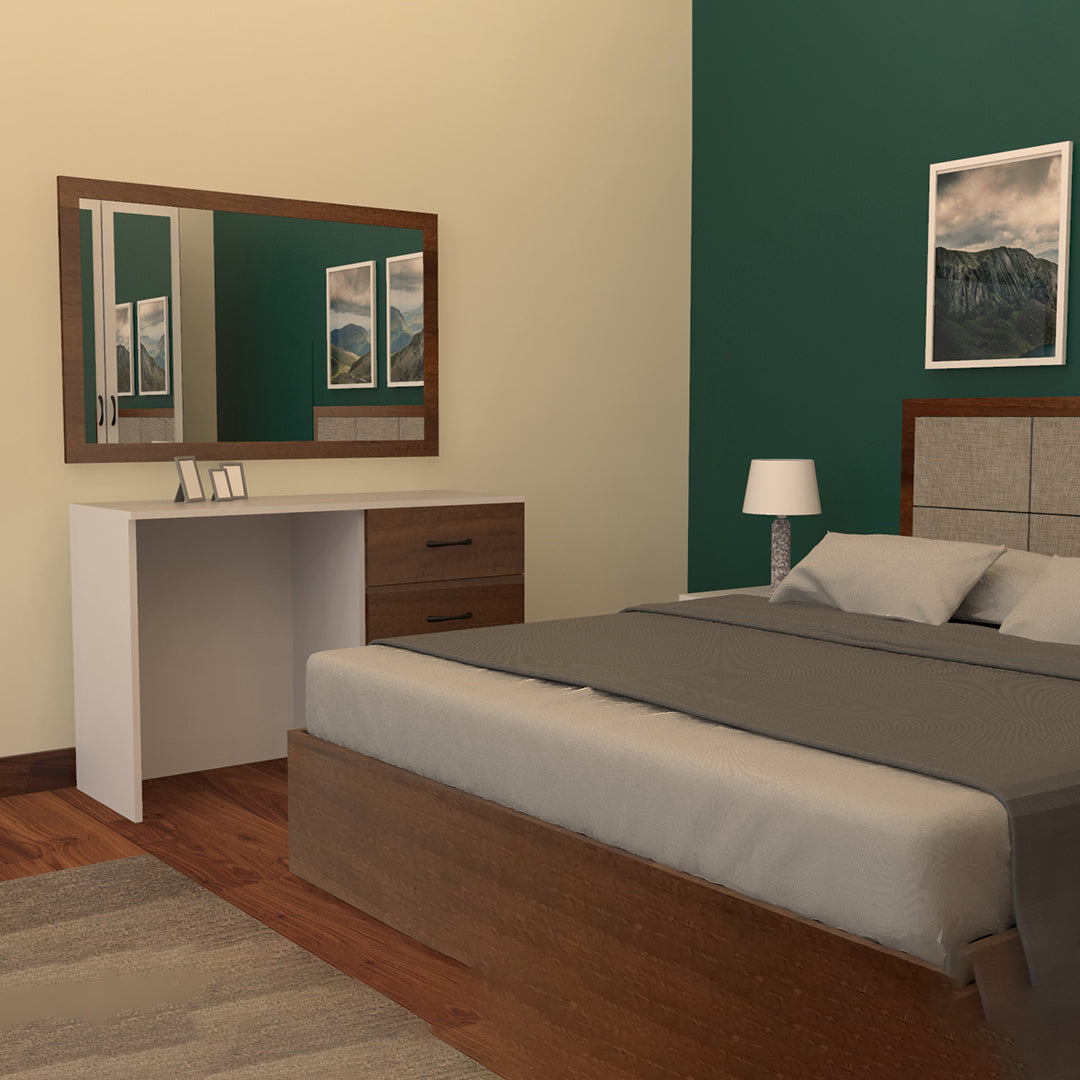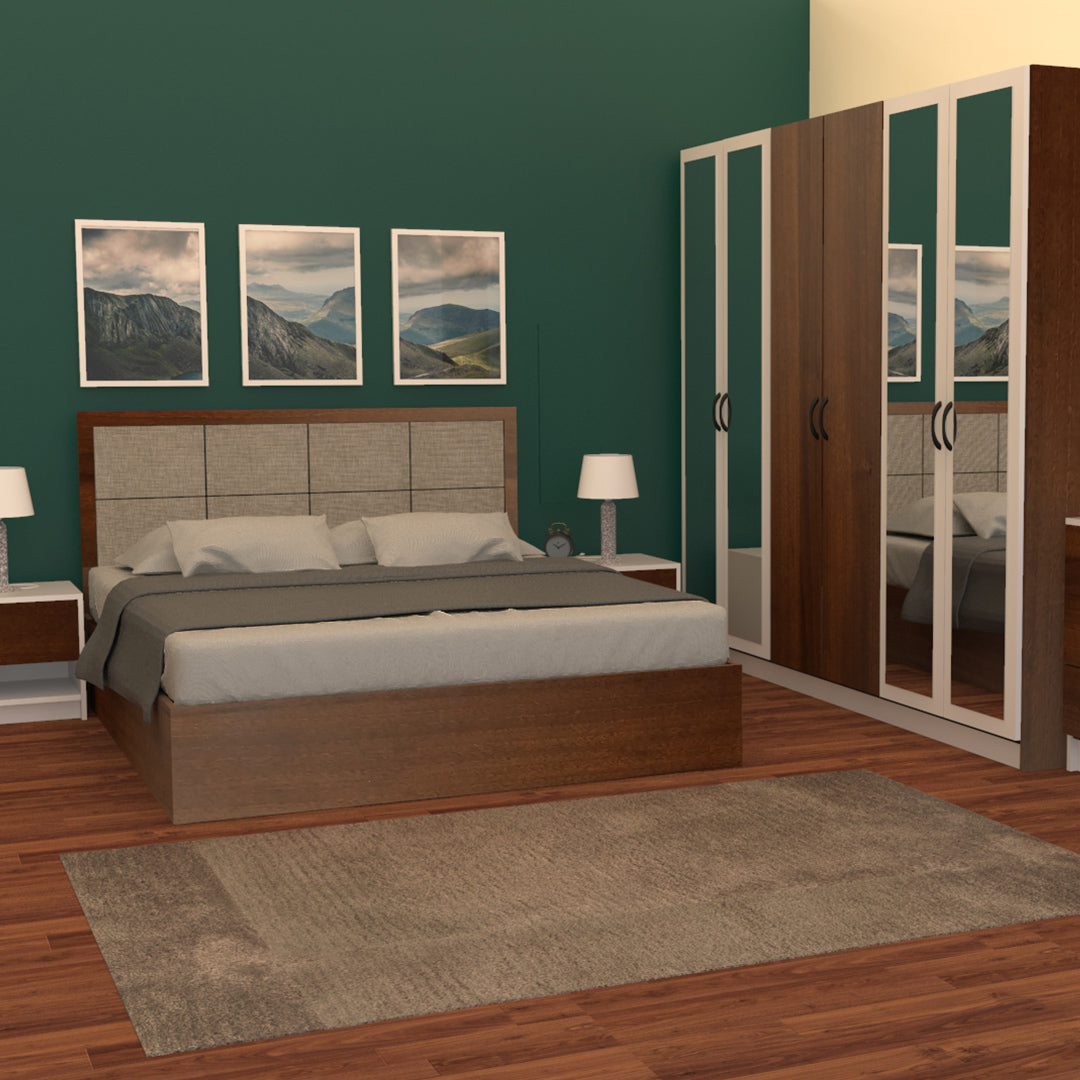 سرير اقتصادي بتصميم أنيق ومريح، مصنوع من خشب طبيعي باللون البني. يتضمن دولابًا بأبواب وأرفف وكومودينوين، وتسريحة تصميم عملي يتناسب مع غرف النوم بمساحات محدودة، مثالي لمحبي الأناقة والاقتصاد.