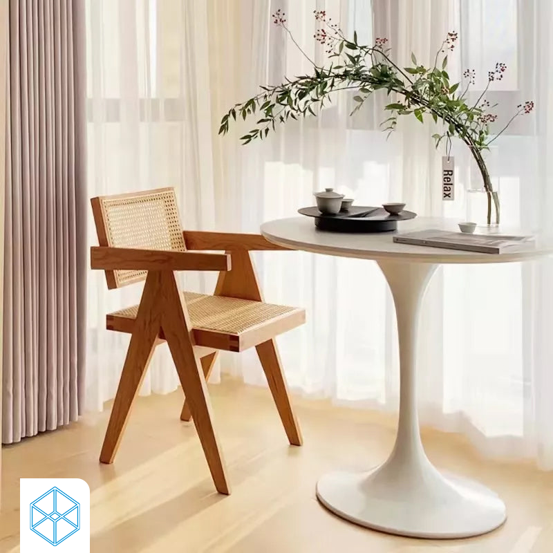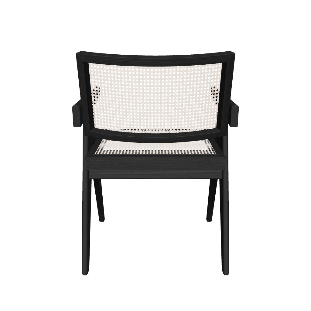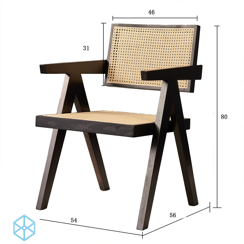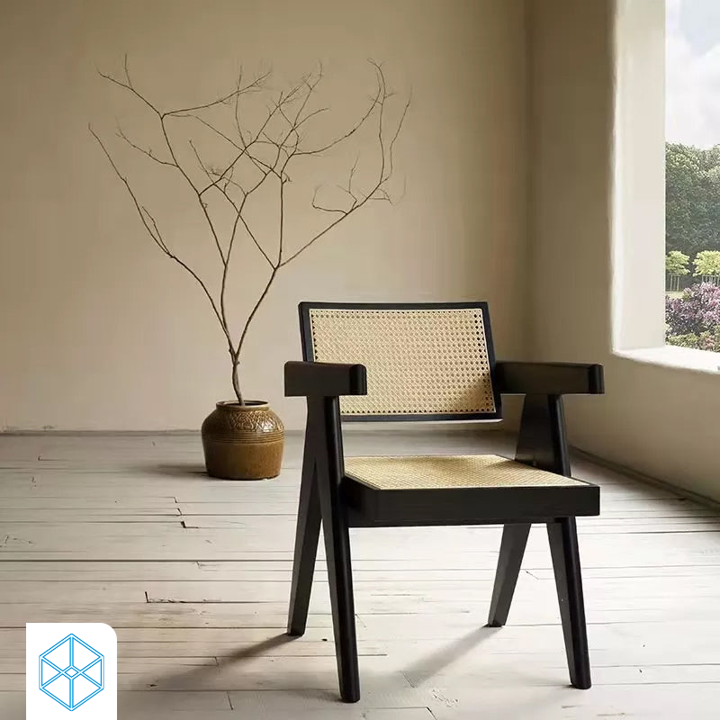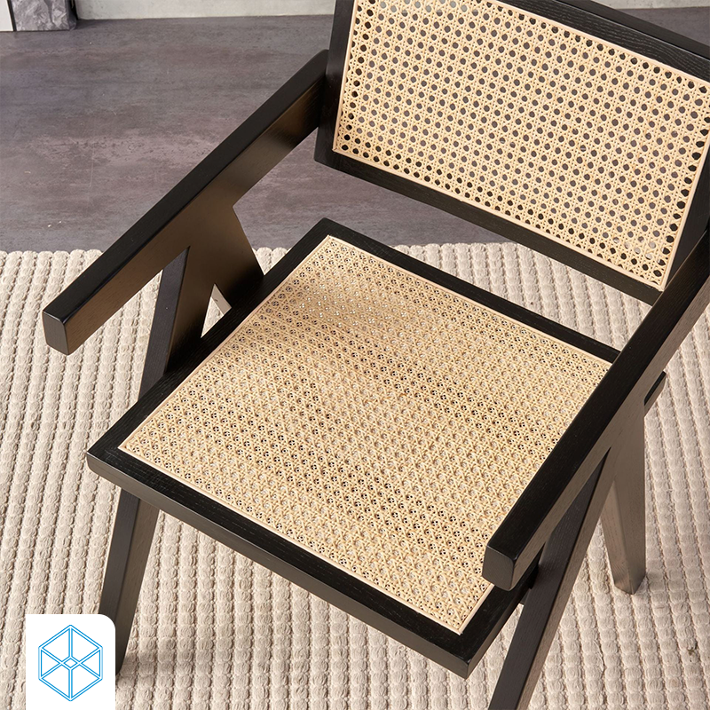 كرسي أسود وخشبي فاتح مصنوع من الروطان الفاخر والخشب الطبيعي. تصميم عصري بأبعاد مثالية. مزيج رائع من الأناقة والراحة،