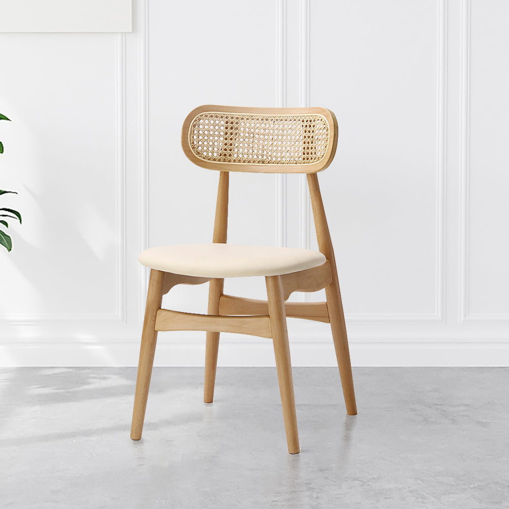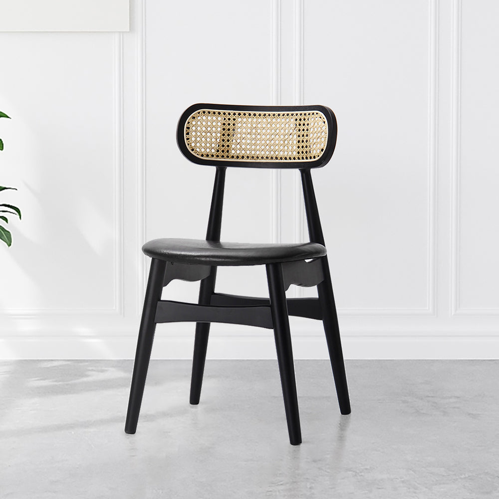 كرسي طعام عصري أنيق يجمع بين الخشب الطبيعي والروطان مع لمسة جلدية لراحة وأناقة تدوم.