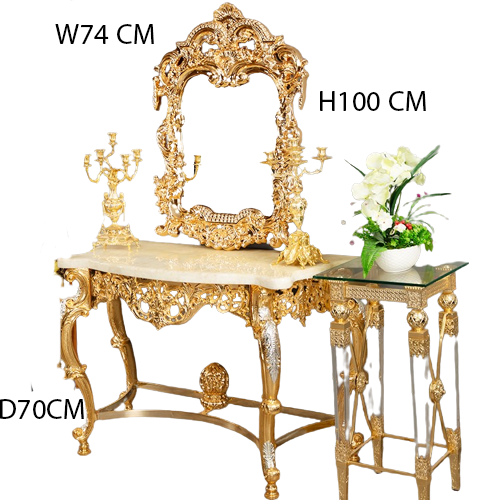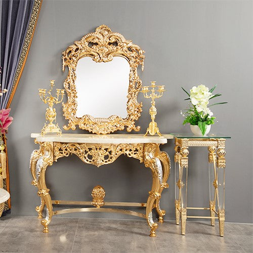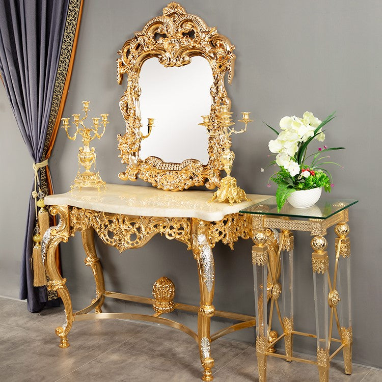 كونسول مع طاولة Teti بتصميم ملكي فاخر يضفي لمسة من الفخامة على مداخل المنزل أو غرف المعيشة. يتميز بلونه الأبيض مع تفاصيل ذهبية أنيقة تضيف طابعًا راقياً، ويُصنع خصيصًا حسب رغبة العميل ليتناسب مع مختلف المساحات. مصنوع من الخشب الطبيعي مع سطح علوي من بديل الرخام ليجمع بين الجمال والمتانة في تصميم واحد يعكس الذوق الملكي.