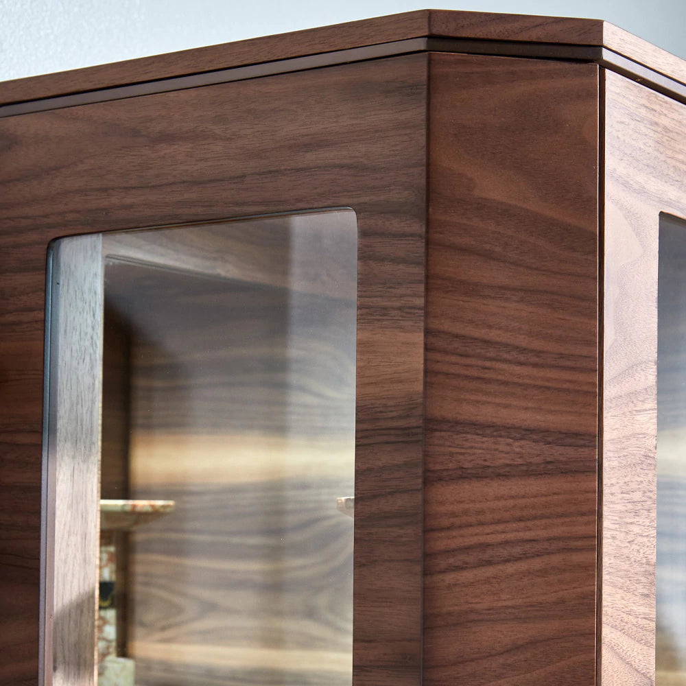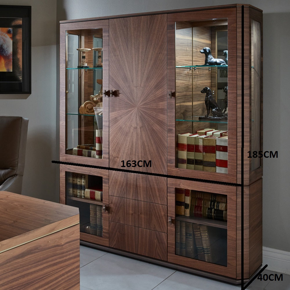 مكتبة فاخرة بأبعاد مثالية (185x163x40 سم)، مصنوعة من خشب طبيعي عالي الجودة بلون بني، مع تفاصيل زجاجية راقية. تصميم عصري يجمع بين الفخامة والأناقة