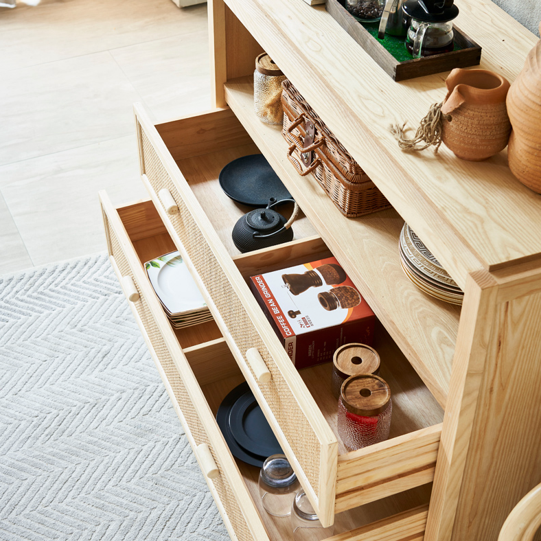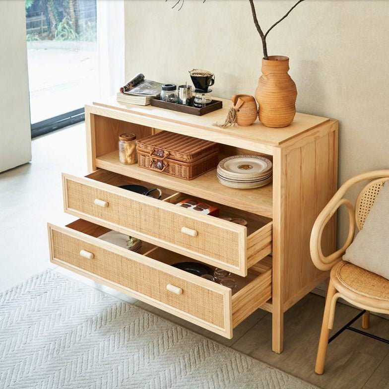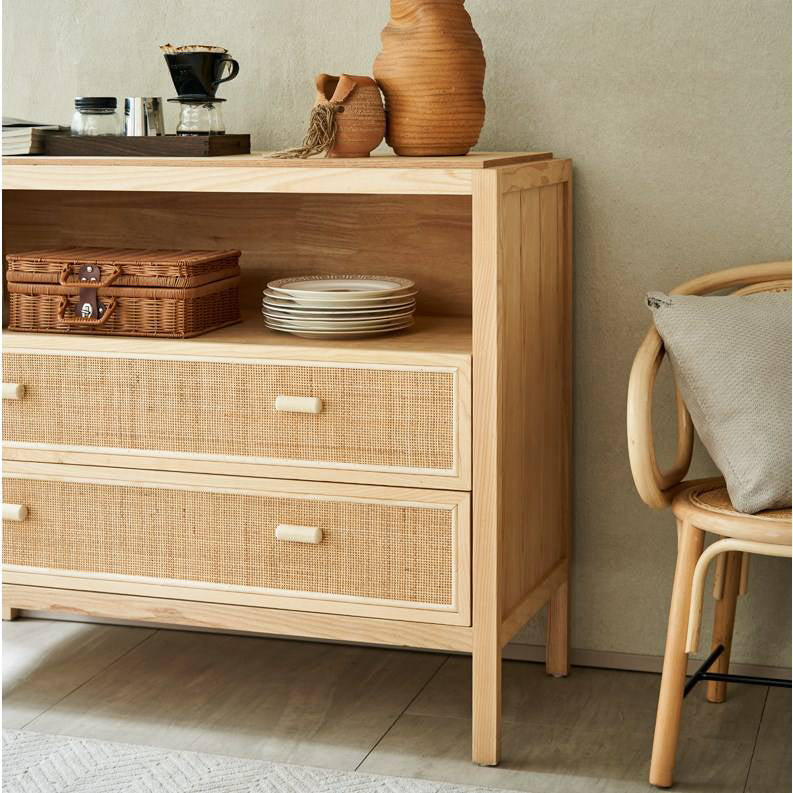 وحدة إدراج جانبية بتصميم عصري، مصنوعة من خشب الزان بلون خشبي. تتميز بأدراج عميقة ومتينة توفر تخزينًا مثاليًا للأشياء الصغيرة. تضيف لمسة عصرية راقية إلى أي مساحة داخلية بأبعاد مثالية