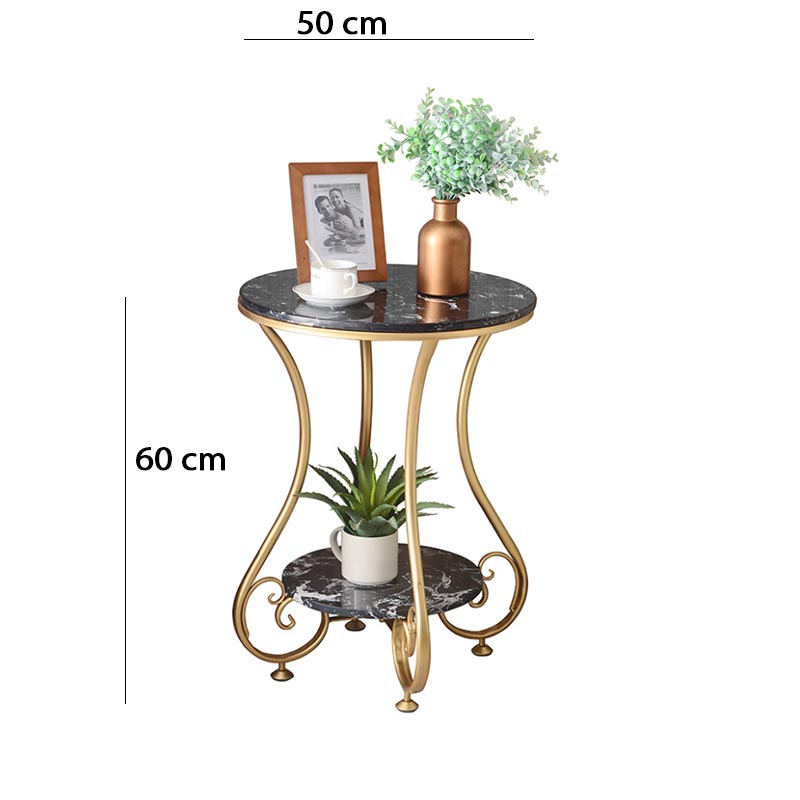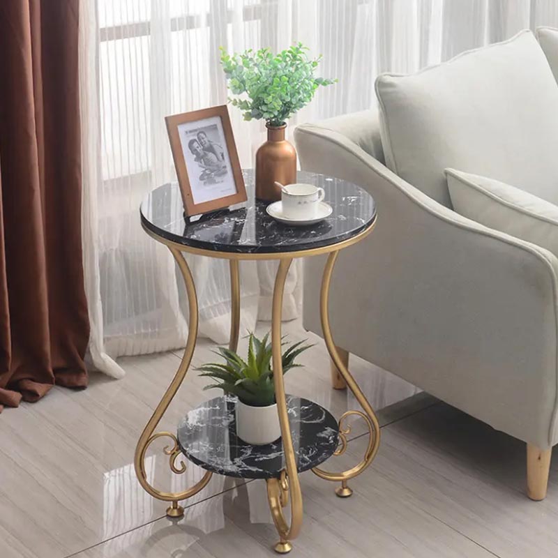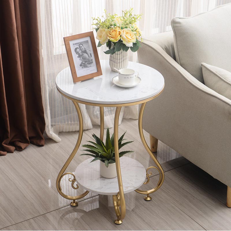 طاولة قهوة بتصميم كلاسيكي أنيق بلون أبيض وذهبي، مصممة بشكل دائري مما يجعلها مناسبة للاستخدام في غرف المعيشة والصالونات. تتميز الطاولة بالمتانة والصلابة بفضل استخدام خامات عالية الجودة من الحديد والبديل الرخامي.